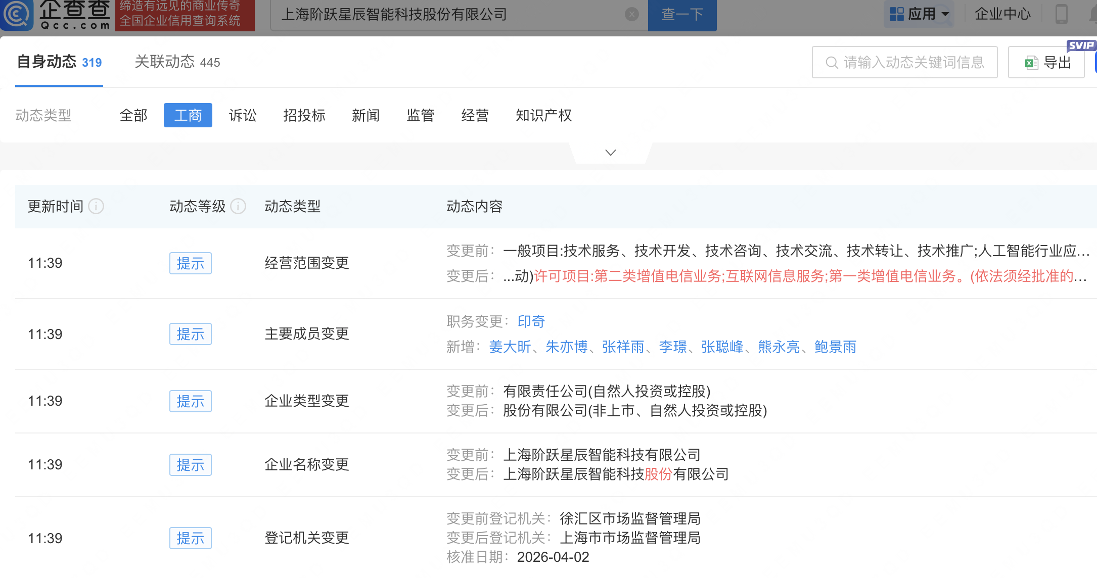 近日,上海阶跃星辰智能科技有限公司企业名称变更为上海阶跃星辰智能科技股份有限公司,企业类型变更为股份有限公司(非上市、自然人投资或控股)。企查查信息显示,该公司成立于2023年4月,法定代表人为印奇,经营范围包含:人工智能基础软件开发;人工智能双创服务平台;软件开发;人工智能通用应用系统等,由跃能齐鑫(上海)企业管理咨询有限公司等共同持股。公开信息显示,阶跃星辰(StepFun)是一家AI大模型公司。
